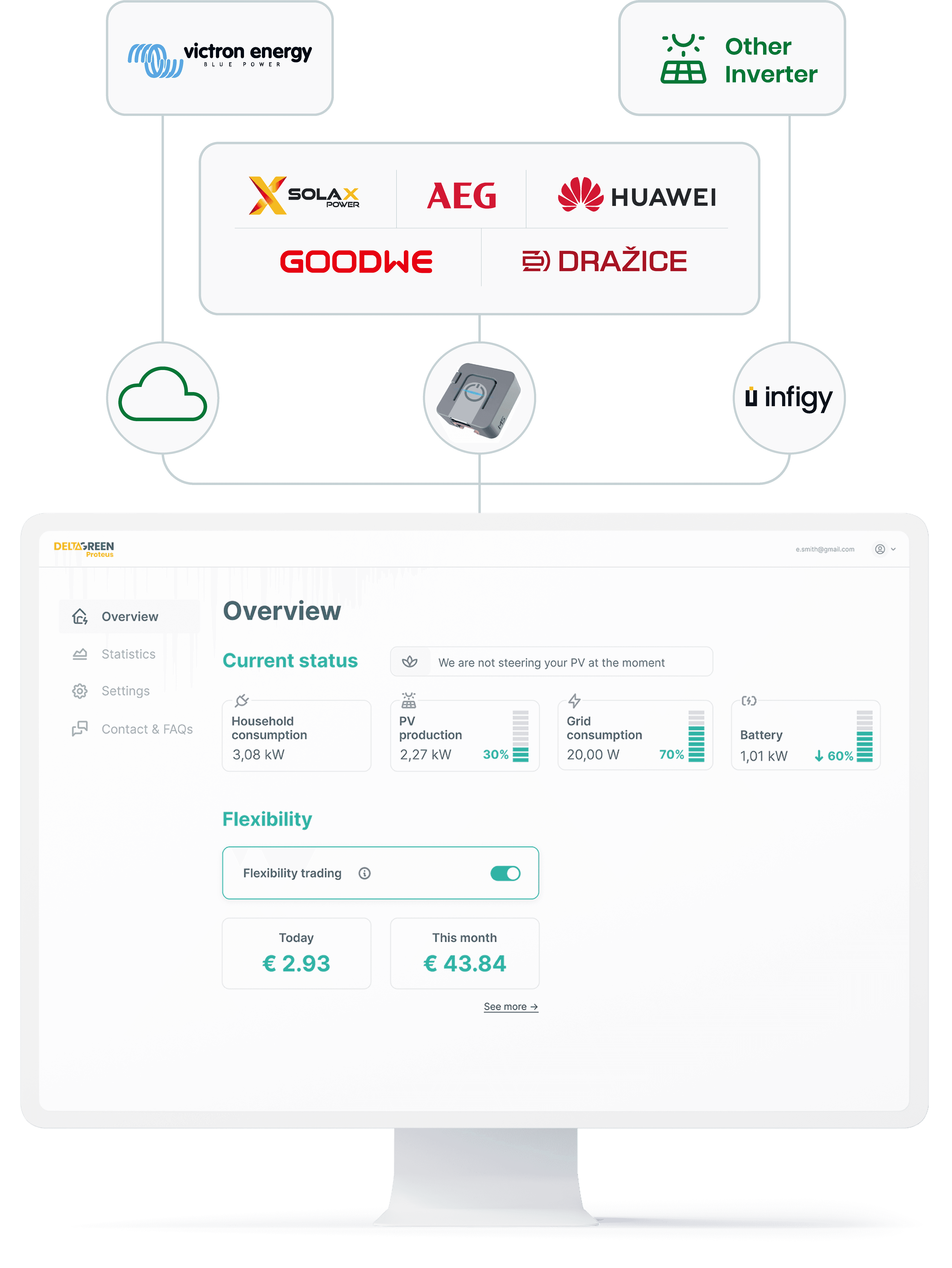 We currently support Victron, Solax, GoodWe, Dražice, AEG and Huawei inverters. Victron connects via the cloud, while the others require our Delta Link.